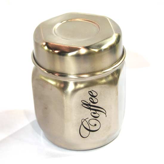Displayed here is a coffee container made of stainless steel. The fine polishing delivers a lustrous appearance. This coffee container is suitable for households and restaurants.