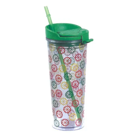 This is a coffee cup featuring a clear body with colorful prints. It comes with a green cover and a straw. This cup is made of high-quality plastic material for durability.