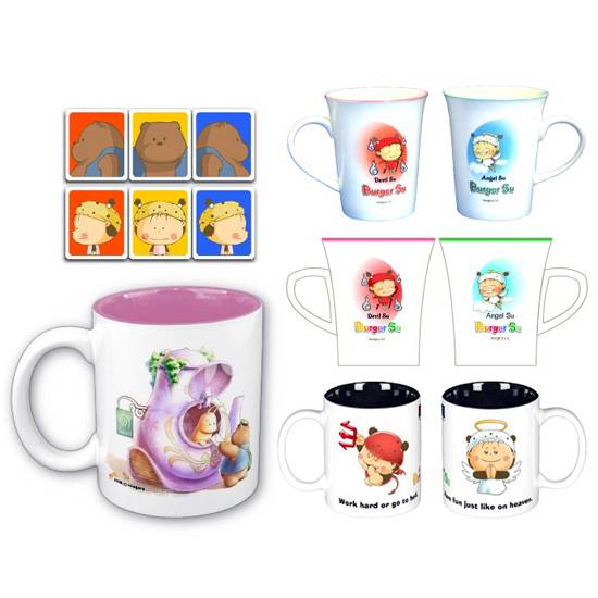The coffee mug has cartoon pattern printed. It has a non-slip handle. It has different sentences printed on the mug.
