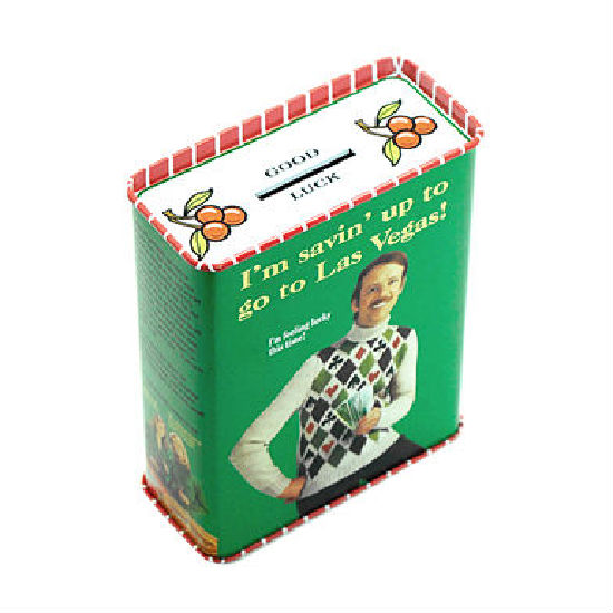 This tin can is designed for storing coins and save money. It has a rectangular body with a slot on top for putting coins in side. The tin can has colorful images on the exterior and offers ample space for coin storage.