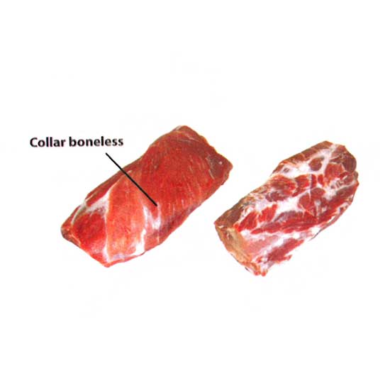 Displayed is a piece of collar pork that is trimmed to boneless. Fed with a balanced diet, the pig has lean flesh, which is a healthier meat than fatty ones. This collar pork is easy to prepare and goes well with all dishes.
