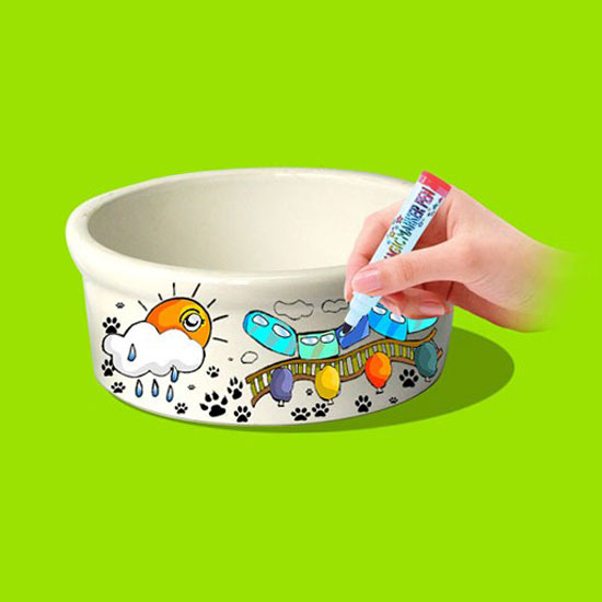 Displayed is a coloring doggy bowl coming with cartoon images. You can color the bowl with magic marker pens. It features ample space to hold more dog food.