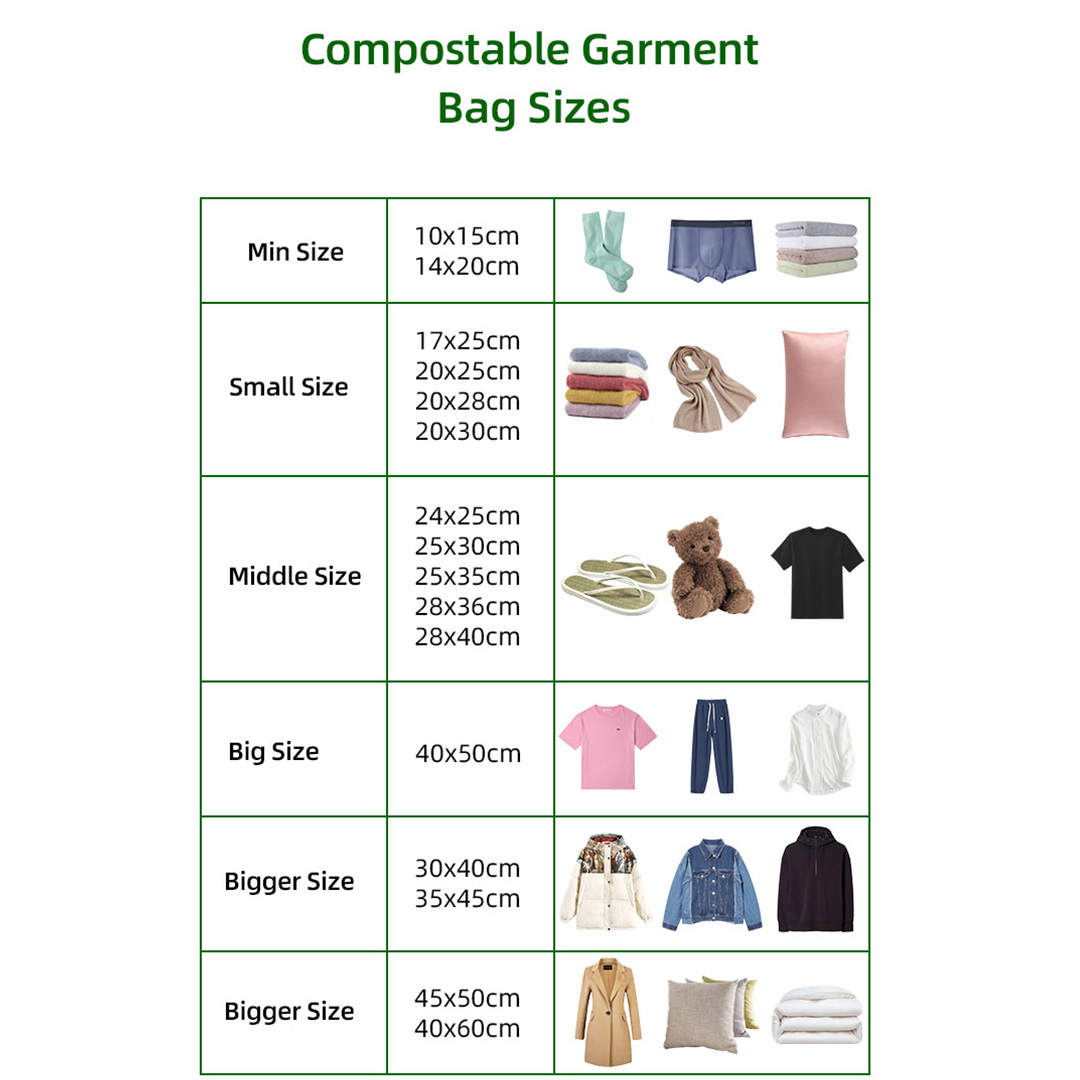 Compostable garment bags can fully degrade into natural substances within 90 to 180 days, leaving no microplastics or toxic residue behind. They provide a sustainable packaging solution for pants, jackets, hoodies, socks, and more.