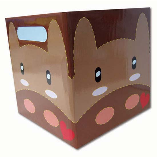 Displayed is a cuboid-shaped container made of paper. It is printed with cute animal faces trimmed with heart-shaped patterns. It is also fitted with handles to ensure easier lifts.