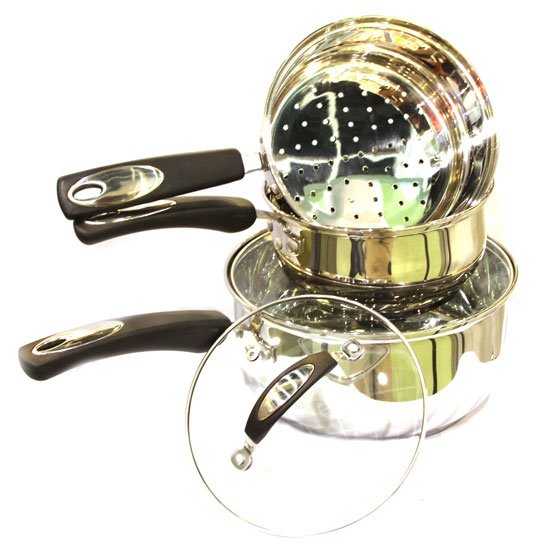 Featured is a set of metal cookware including various sizes of pots. The pots ensure durable use with a solid structure and a mirroring finish. The handles are coated with plastic for insulation.