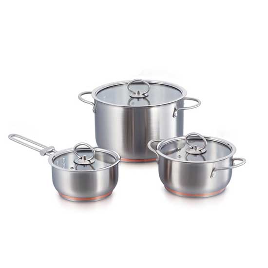 Showcased is a set of stainless steel pots coming in different sizes. Each pot features an impact-resistant bottom for enhanced durability. The stainless steel structure is sturdy enough to handle various cooking tasks.