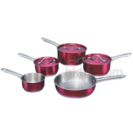 Cookware set in 8 pieces, saucepan and frypan, color painted body and flat stainless steel lid, brushed interior, thick aluminum core in the capsuled bottom, induction base
