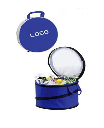 Pictured here is a round cooler bag made of 600D polyester. It offers ample space for storing multiple bottles of drinks and has a zipper cover and two handles. This cooler bag has a pop-up structure and can be folded flat for easy storage. It can be adorned with a logo on top and is excellent for beach trips, parties, camping and other outdoor activities.