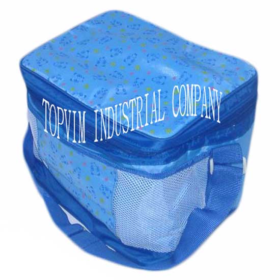 Displayed here is a cooler bag in a blue color. It features a zip-up design for easy closure. It comes with a mesh pocket for storing accessories.