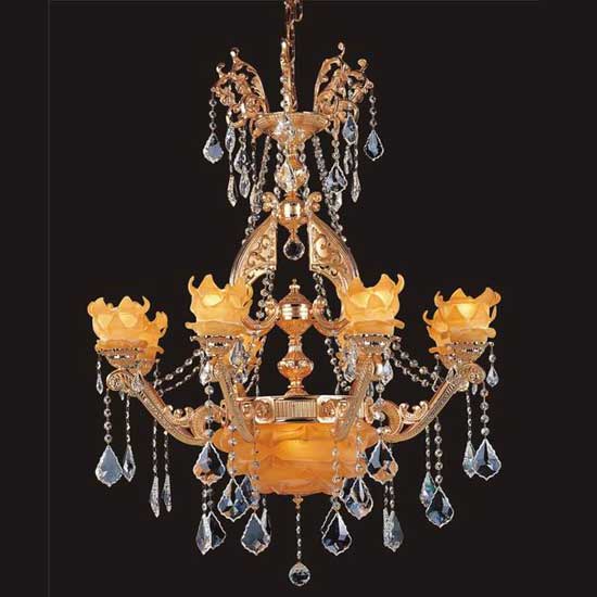 Highlighted is an exquisite chandelier coming with a satin golden base. The lamp is crafted with excellent details showcasing a gorgeous curve. Sparkling crystals are added to make this lamp perfect for grand occasions.