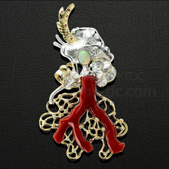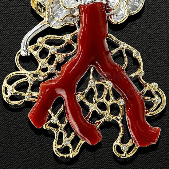 - Material: coral 2.42ct, diamond 0.56ct, ruby 0.06ct, 750KWG.