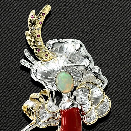 Elaborate design and consummate artistry result in this captivating piece of work. The ruffled floral embellishment takes an organic shape, stemming from a coral branch that lies above a golden net embedded with glittering diamonds. An iridescent gem is centered in the ruffles that seem to sway with the gentle current.