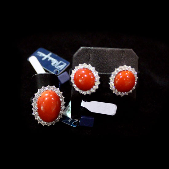 This coral and diamond jewelry set features a pair of earrings and a ring. The coral cabochons are nicely polished to offer superior roundness and smoothness. They are surrounded by white, loose diamonds for an eye-catching sparkle.