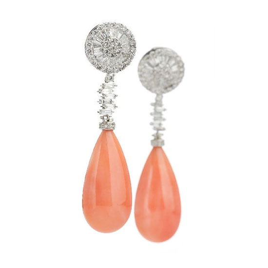 This is a pair of earrings with a dainty and chic design. Each piece features an 18K white gold mounting and is highlighted with a pear-shaped coral embellishment. These earrings are finely adorned with sparkling diamonds for enhanced luxuriousness.