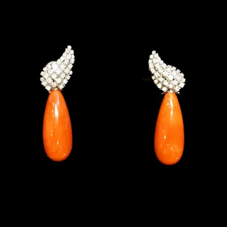 This is a pair of earrings that is finely crafted with refined details. The large coral ornaments add a touch of elegance to these earrings. This pair of earrings is accented with shimmering diamonds.