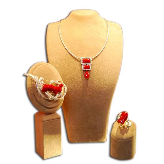 This is a set of red coral jewellery ladies and women, including a necklace, a ring and a brooch. The drop necklace features two diamond-surrounded coral in rectangular shape and a pear-shaped coral as its pendant. Embellished with curved lines underneath, the red coral become the focal point of the brooch.