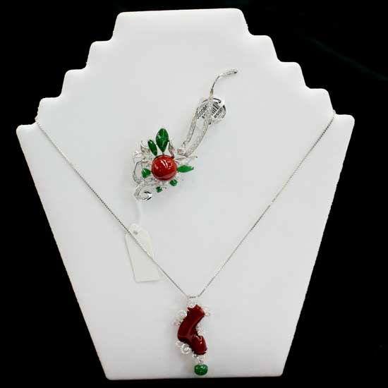 The ladies' jewelry set is completed by a pendant and a necklace with a matching design. The lustrous coral stones are gracefully complemented by the luxurious addition of twinkling diamonds for extra shine. Perfected by high-translucency jade beads, this coral jewelry set is unquestionably a favorite for elegant ladies.