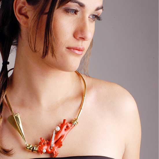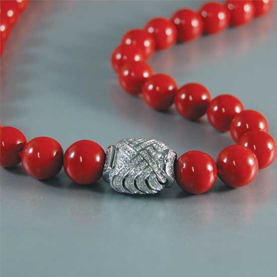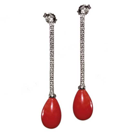 This is a coral jewelry set with a 48K gold necklace, a red coral necklace and 18K gold earrings. The 48K gold necklace is accented with a coral branch, sparkling diamonds and brilliant round pearls. The red coral bead necklace features an 18K white gold and diamond clasp for added style. The 18K white gold earrings are accented with red coral drops and diamonds for a brilliant shine.