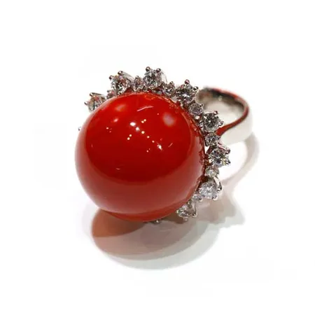 This finger ring boasts an elegant and eye-catching design. It features a big red coral centerpiece in a ball shape with a polished finish. The diamond elements encircle the centerpiece for added charm.