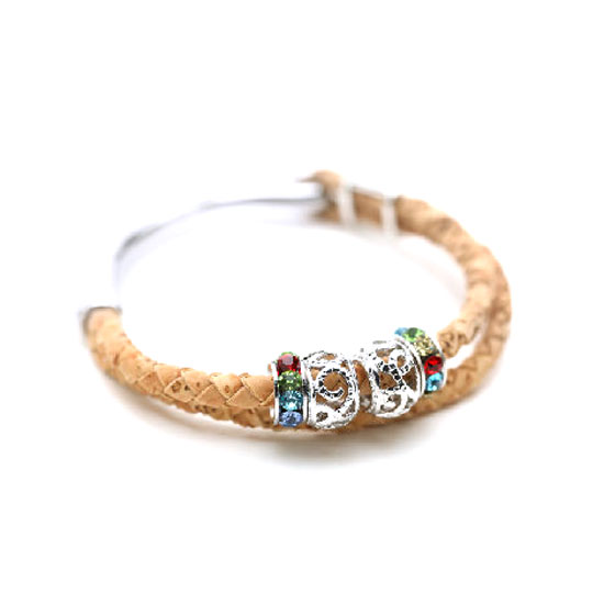 This is a cork bracelet with braided cork strips in a natural color. It features silvery embellishments with colorful stone accents. This bracelet is a great accessory for assorted elegant outfits.