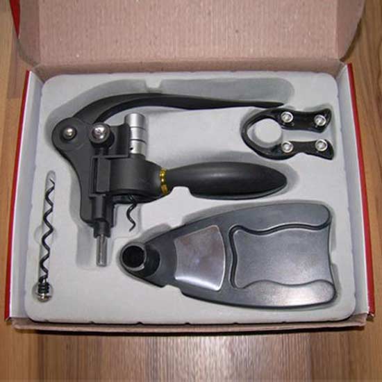 Presented is a corkscrew set that includes a metal corkscrew and a bottle cutter. The metal spiral screw is coated to reinforce sturdiness and prevent rust. This potent corkscrew set is a great addition to a household bar.