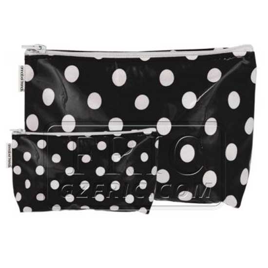 Displayed here is a cosmetic bag in black and white colors. The zip-up closure ensures secure storage. The polka dot patterns add a dash of modernity.