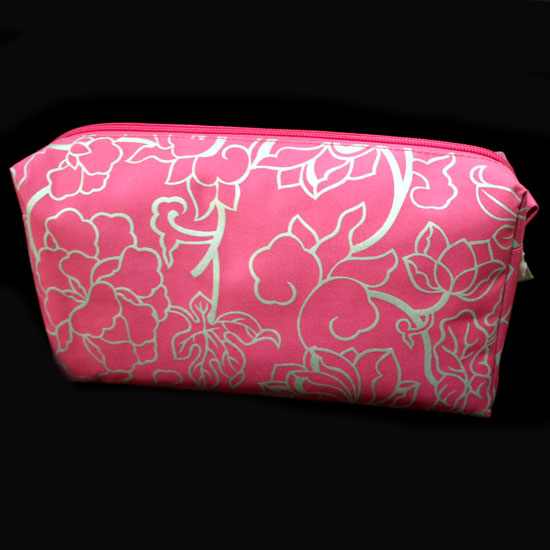 Displayed is a cosmetic bag which is weaved with durable polyester. Its lovely pink shell is ornamented with elegant floral patterns. This piece is completed with a secure zipped closure.