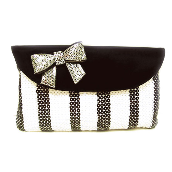 The cosmetic bag delights you with its chic and girlish design. The ribbon bow embellishment and striped patterns are adorned elegantly with the shimmering sequin accents. This adorable cosmetic bag makes a delightful addition for fashionable ladies.