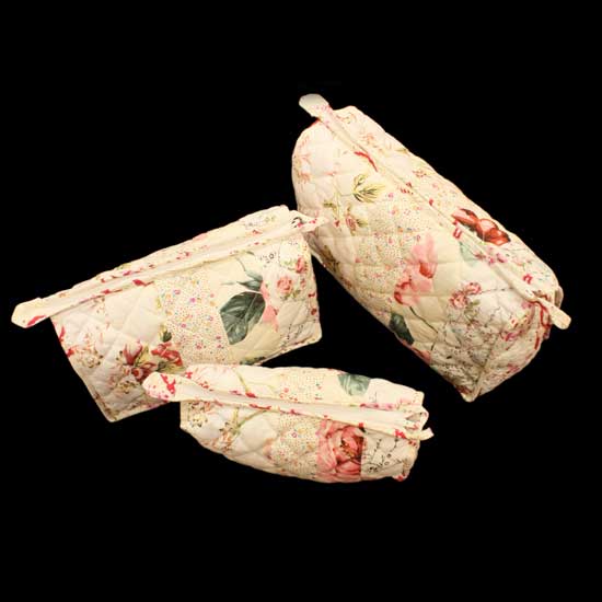 Pictured is a series of cosmetic bags in different sizes. The adorable floral patterns add a girlish touch. These cosmetic bags are perfect to hold cosmetics, toiletries or other essentials.