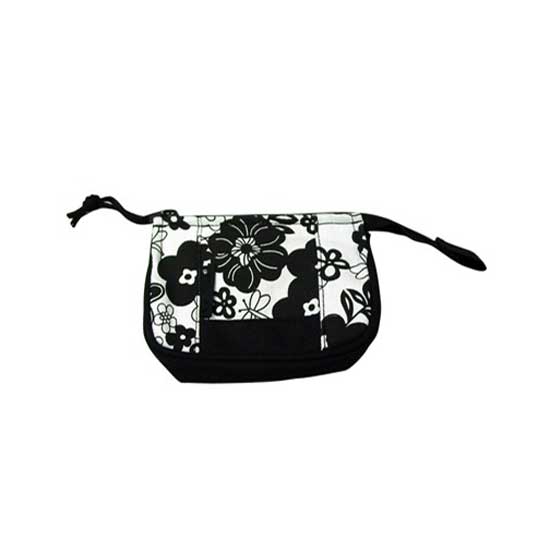This cosmetic bag comes with a fashionable design. Featuring black floral patterns on a white background, this cosmetic bag is elegant and tasteful. The top zipper closure makes this makeup bag a convenient choice for traveling.