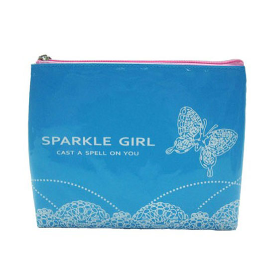 This is a cosmetic bag that comes in a square shape. The glossy body is decorated with a butterfly pattern for a fashionable touch. This makeup bag has a top zipper for easy usage.