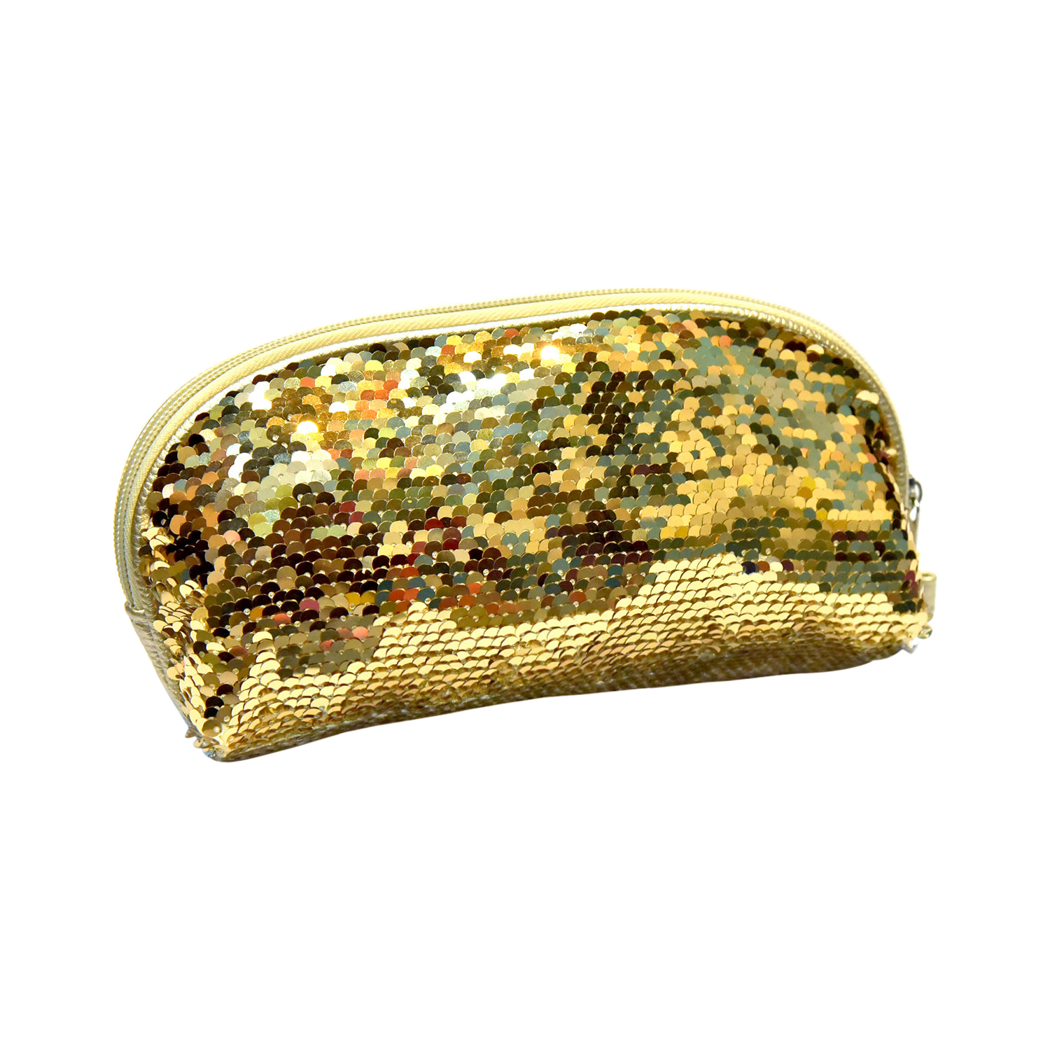 Displayed here is a cosmetic bag made of shiny sequins in gold tone. It has enough room for organizing and storing your beauty essentials and has a zipper on top. This cosmetic bag flaunts a beautiful design and can be easily stored inside backpacks or luggage.