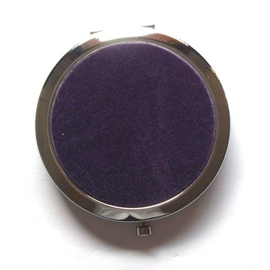 The featuring item is a portable cosmetic mirror with an elegant and stylish design. Round in shape, the mirror has a purple cover on the sleek and shimmeing frame.