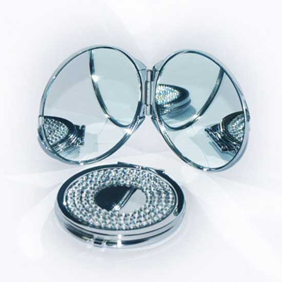 Displayed here is a cosmetic mirror made of metal and plastic. It is adorned with glittering stones for added style. This foldable mirror is classy, durable and light in weight.