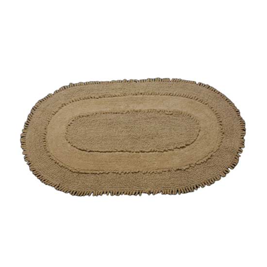 The cotton bath mat flaunts an oval style. Its shape resembles the shape of a racecourse. The three-track design and fringes offer added uniqueness. The carpet boasts excellent absorbency.