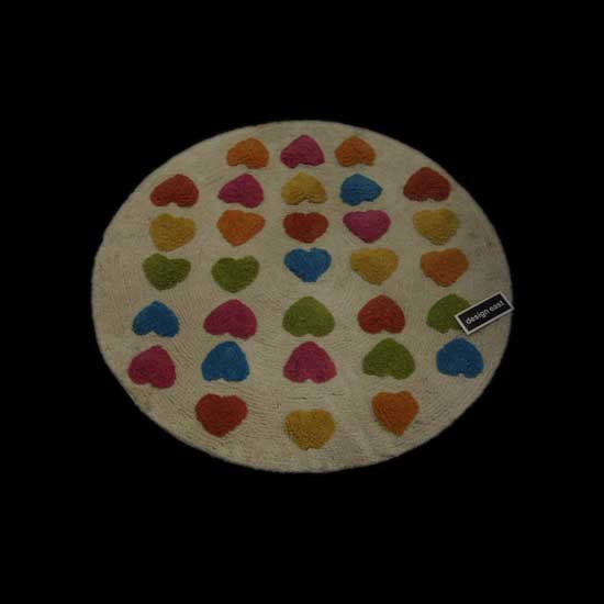 This cotton carpet showcases a circular style. The design flaunts tidily arranged heart shapes in opposite directions. The vivid hearts refresh the eyes.