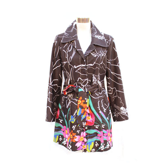 This ladies’ jacket features long sleeves, a notch lapel and a matching belt. It is made of 100% cotton for a comfortable touch. This cotton jacket is designed with flower prints in bright colors for an eye-catching look.