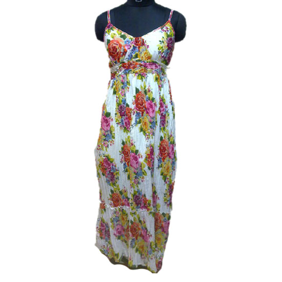 The showcased long dress boasts a sweetheart neckline linked to the shoulders by spaghetti straps. The vivid-colored floral patterns spice up the gorgeous dress with a touch of femininity. The ruched skirt gathered at an empire waistline cascades down to the floor to showcase slim and elongated silhouettes.