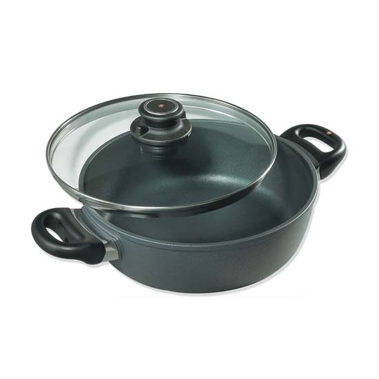 The large-capacity 8.5qt covered deep stock pot has two side handles. It also has a vented metal-rimmed heat tempered glass cover and is perfect for simmering stocks, vegetables, lobsters, soup and pasta.