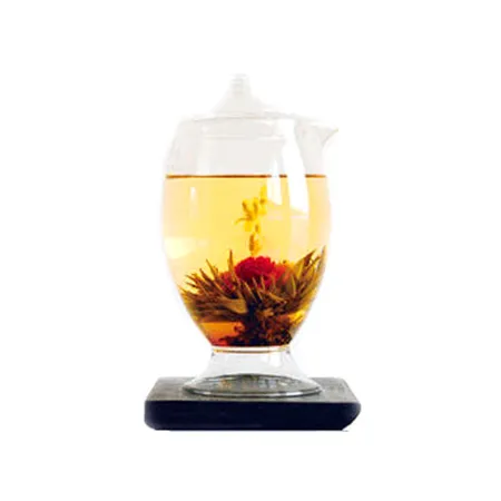 As shown is a Chinese crafted tea which is named "Yuhuan Ring". It showcases a yellowish transparent hue that looks pleasing. This tea is brewed with a variety of well-sourced ingredients.