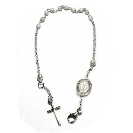 Photographed is a bracelet made in Italy for promised quality. The bracelet highlights a construction of 18K white gold. The delicate Christian-themed accents add style for the bracelet.