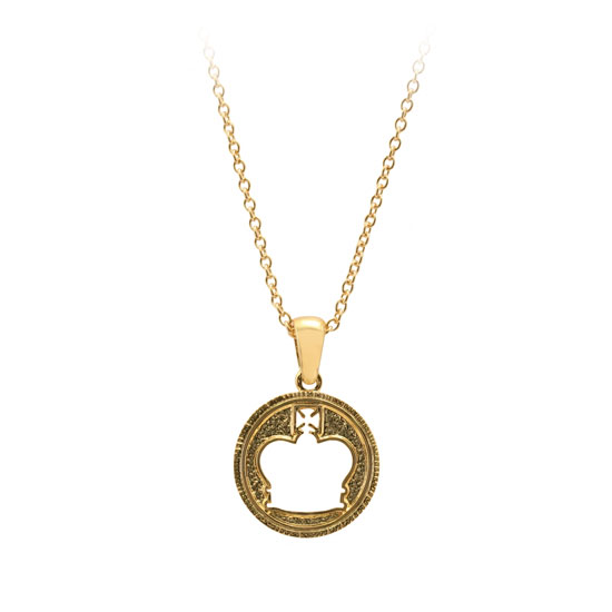 This round pendant comes with a spectacular golden finish. The center is carved with a crown shape for a luxurious flair. This gorgeous piece is perfect for everyday wear.