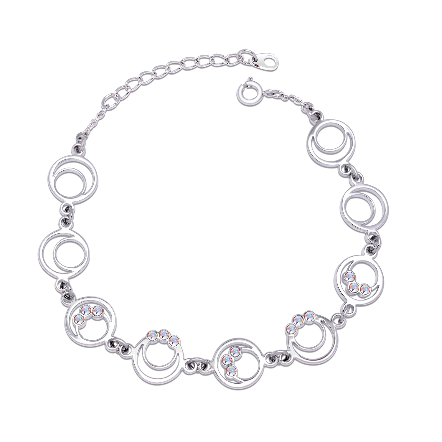Bring the moon close to you with this crystal charm bracelet. This charm bracelet features charms with a cut-out crescent moon and a cut-out full moon. Adorned on the charms are shimmery crystals, so the bracelet emits a glimmering sheen that would remind you of the indescribable and tranquil glow of the moon. Captivating and undeniably romantic, this crystal charm bracelet is for all astrology lovers and dreamy people out there.