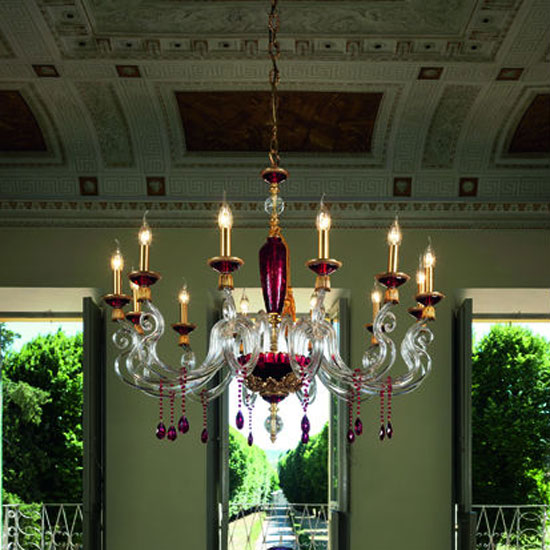 Decorated by crystal and brass elements, the Barocco-style chandelier adds an elegant touch to your home decoration. The Swarovski ruby pendants embellish the chandelier perfectly. Featuring 12 candelabra bulbs, this chandelier diffuses pleasant and warm light for illumination.