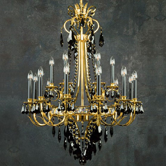 Only the very best materials are used for this chandelier. Made with a 24-carat gold finished frame and special dark colored Swarovski strass crystals, it is a true sign of quality, splendid design, prestige and luxury. All our finishes feature a long-lasting, extra high-resistance coating of oven-baked protective varnish - we know of no better.