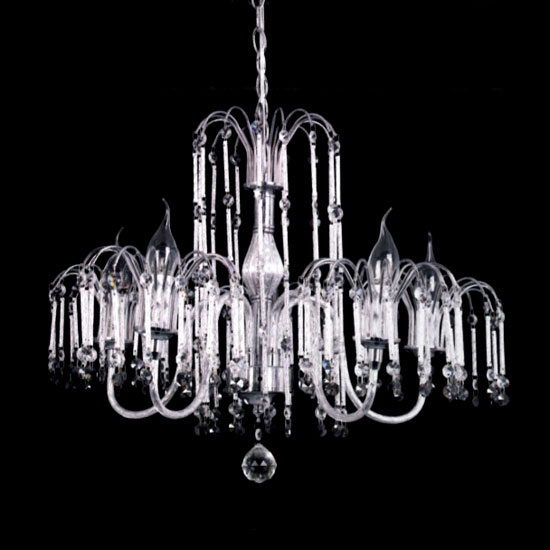 This is a crystal chandelier with a luxurious and fashionable design. This lamp is also hung with crystal chains for a sophisticated touch. It is a great lighting choice for any trendy home décor.