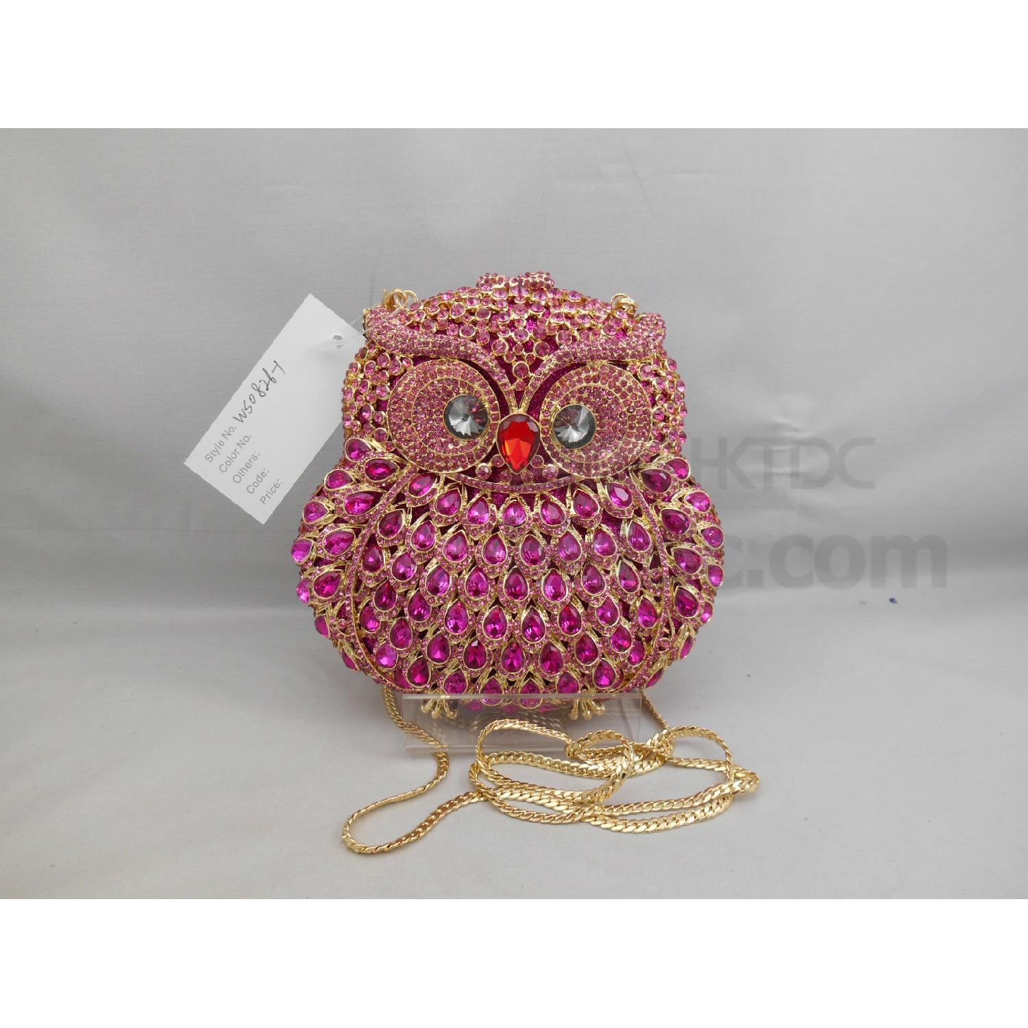 Crystal bag comes in multi colors in owl shape, gold metal frame, gold long chain, PU lining.
