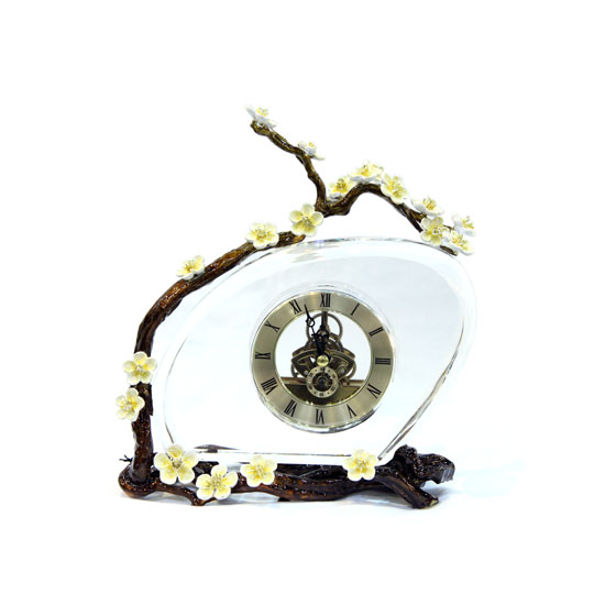 This mechanical clock is delicately crafted into a colorless crystal for a simplistic charm. The stand that supports and surrounds the crystal is wonderfully designed into a tree with blossoming flowers. The tree stand with the irregular crystal clock that resembles a rock suggests a beautiful poetic touch.