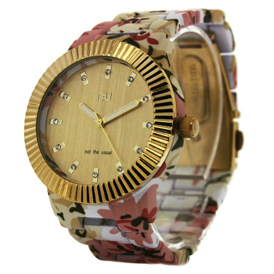- Beige-tone watch bracelet featuring delicate floral prints.