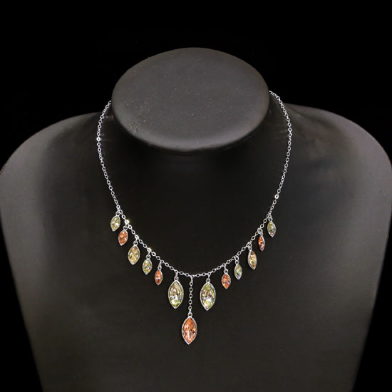 This is a necklace coming with delicate workmanship. The leaf-like pendants, made from multi-colored crystal glass, are beautifully suspended from the necklace. Spice up your summer outfit with this wonderful necklace.